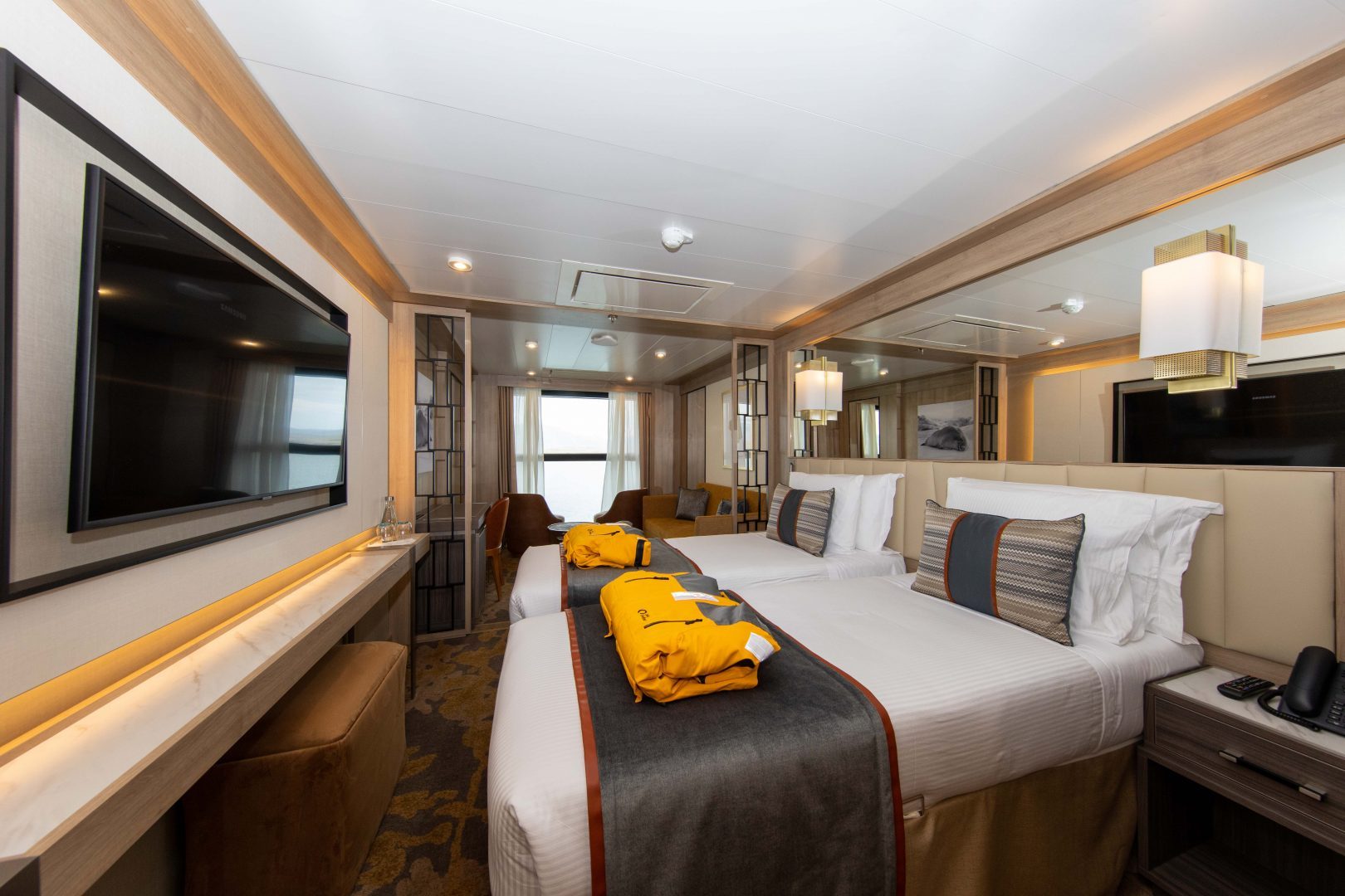 Superior Suite: Located on Decks 5 and 6, and approximately 278 sq. ft. (26 sq. m) in size, these cabins have one double or two single beds, and a 110 sq. ft. (10 sq. m) walk-out balcony with access from sitting room and bedroom. A separate sitting area with sofa, walk-in closet, refrigerator, TV, state of the art “infotainment” system, and private bathroom with shower is also featured in each cabin.