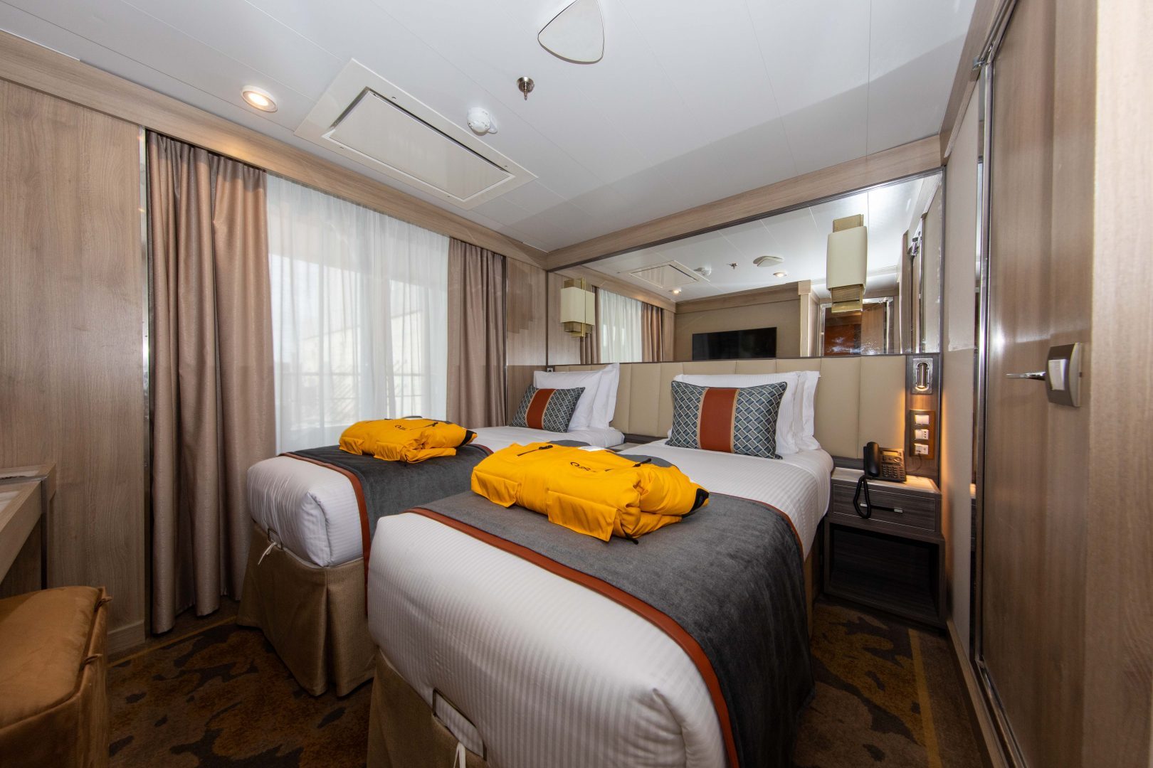 Veranda Suite: Located on Decks 5 and 6, and approximately 215 sq. ft. (20 sq. m) in size, these cabins have one double or two single beds, and a 55 sq. ft. (5 sq. m) walk-out balcony. A sitting area with sofa, refrigerator, TV, state of the art “infotainment” system, and private bathroom with shower is also featured in each cabin.