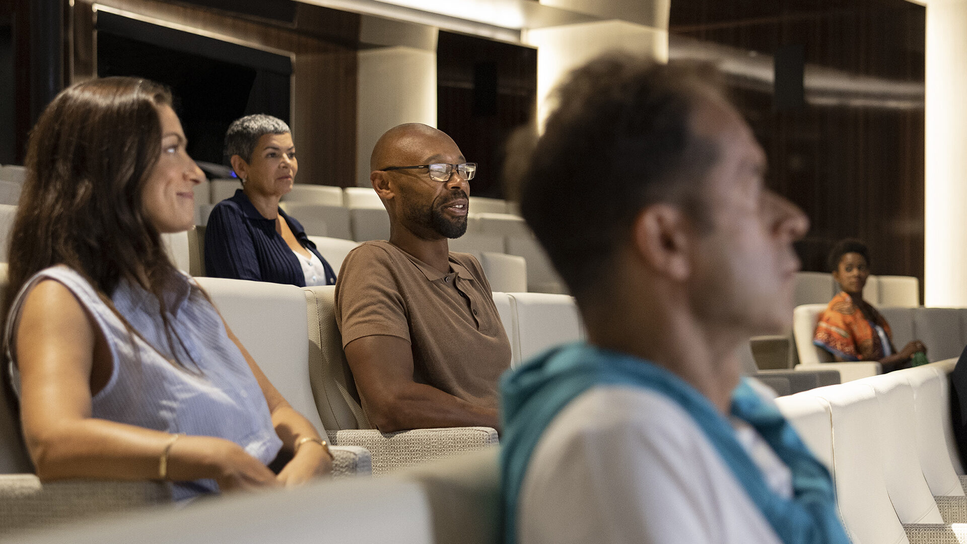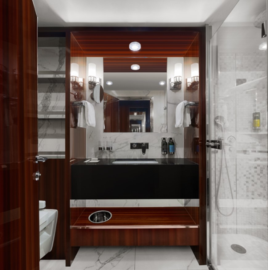 Journey Suite – 1-bedroom suite with a private balcony. This suite includes Butler Service and Expanded Room Service, located on Decks 5 and 6 accommodates up to 3 guests. 382 sq. ft. of living space, with a walk-in closet and wardrobe. Featuring a comfortable living room with a sofa and an elegant vanity and two wall-mounted TVs.
