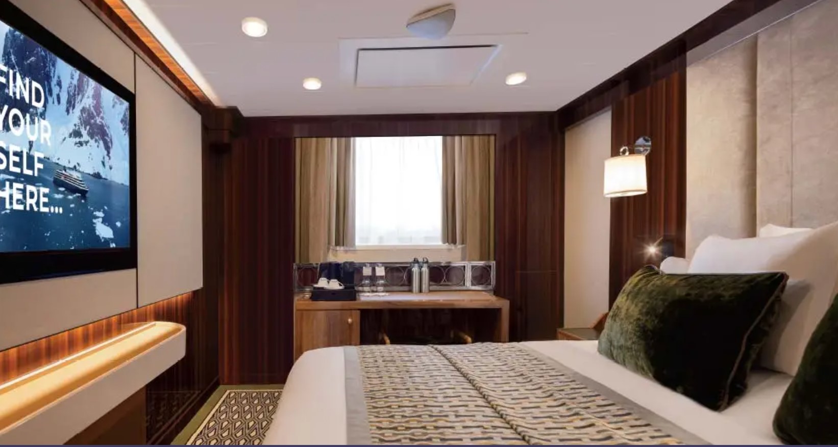 Adventure Oceanview Stateroom (AO)– Queen bed with panoramic picture window, 183 sq. ft. including a sitting area, TV, and spa bath.