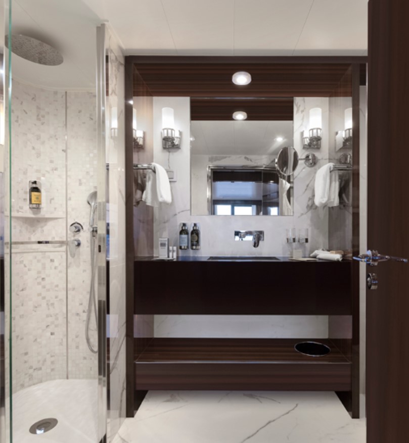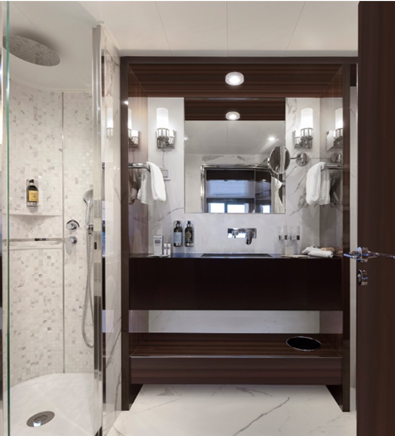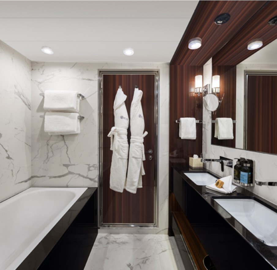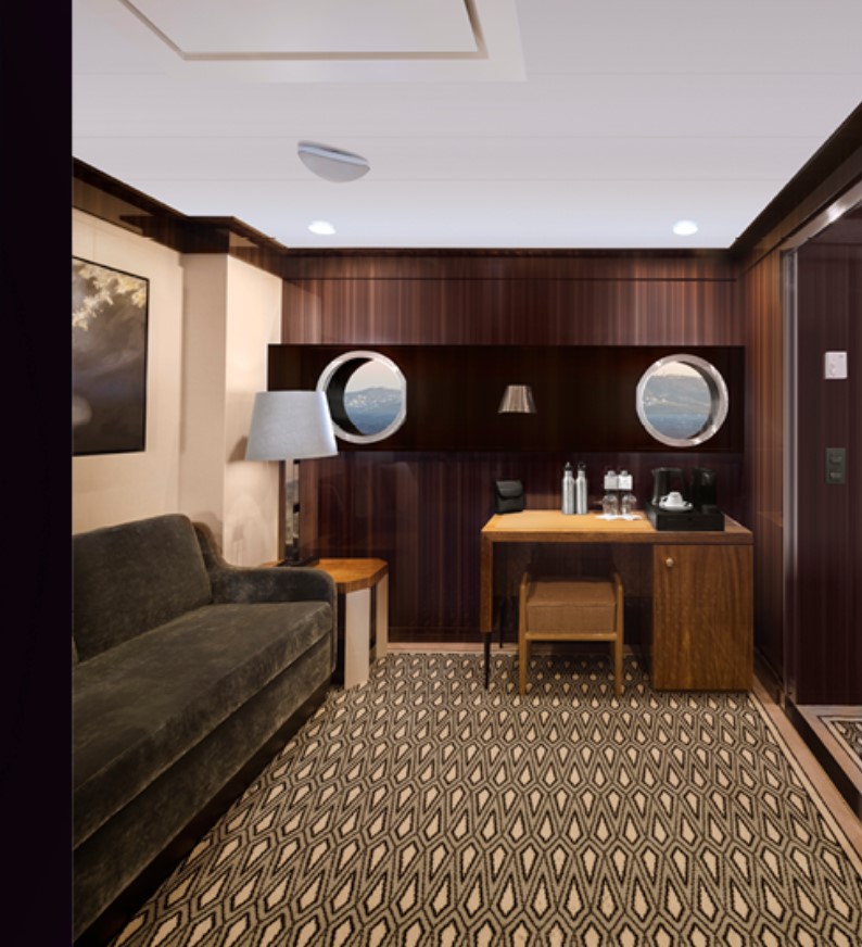 The Navigator Suite –1-bedroom suite with an oversized private balcony. This suite includes Butler Service and Expanded Room Service. Located on Decks 5 and 6, it can accommodate up to 3 guests. 465 sq. ft. of space, with a private balcony and comfortable living room complete with a sofa and vanity. The bathroom has double sinks and a tub, and a walk-in closet and wardrobe.