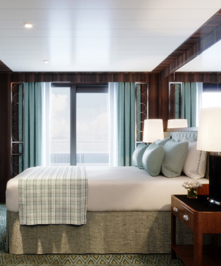 Veranda Deluxe Stateroom (E2) – Located on Deck 6, accommodates up to 3 guests. 300 sq. ft. including a walk out balcony. Suite also includes a living room with a sofa and vanity.