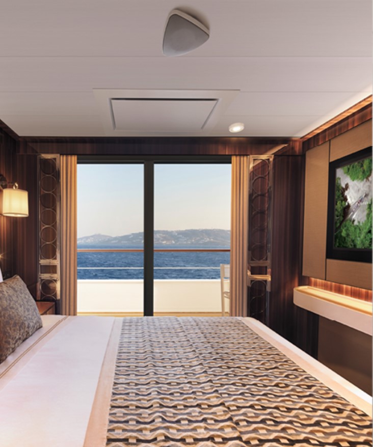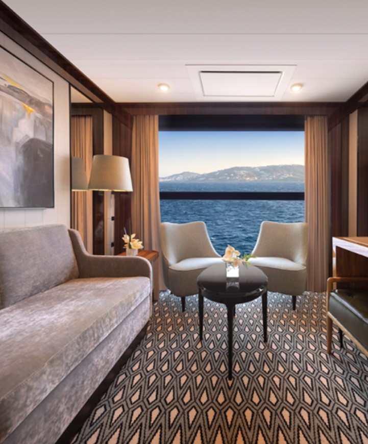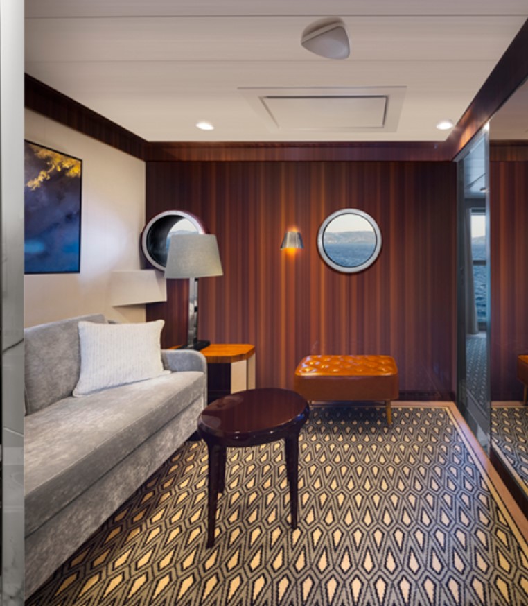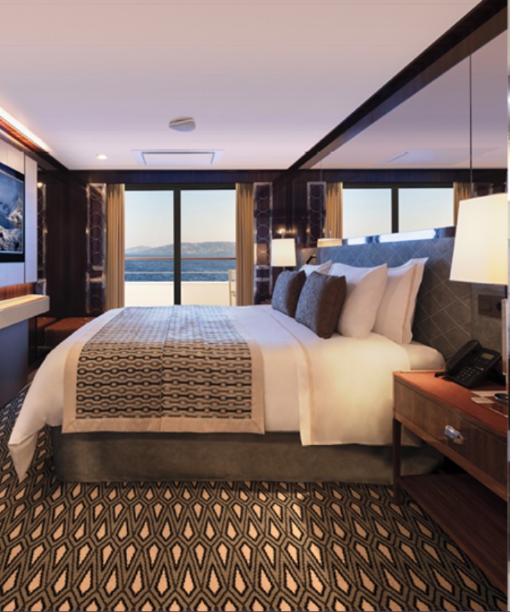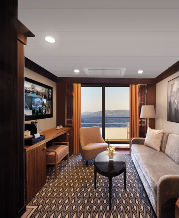 Horizon Stateroom (A1/A2) – Located on Deck 5 and 6 accommodates up to 2 guests, 270 sq. ft. including Juliette Balcony with top-drop electric window and a sitting area with sofa and TV.