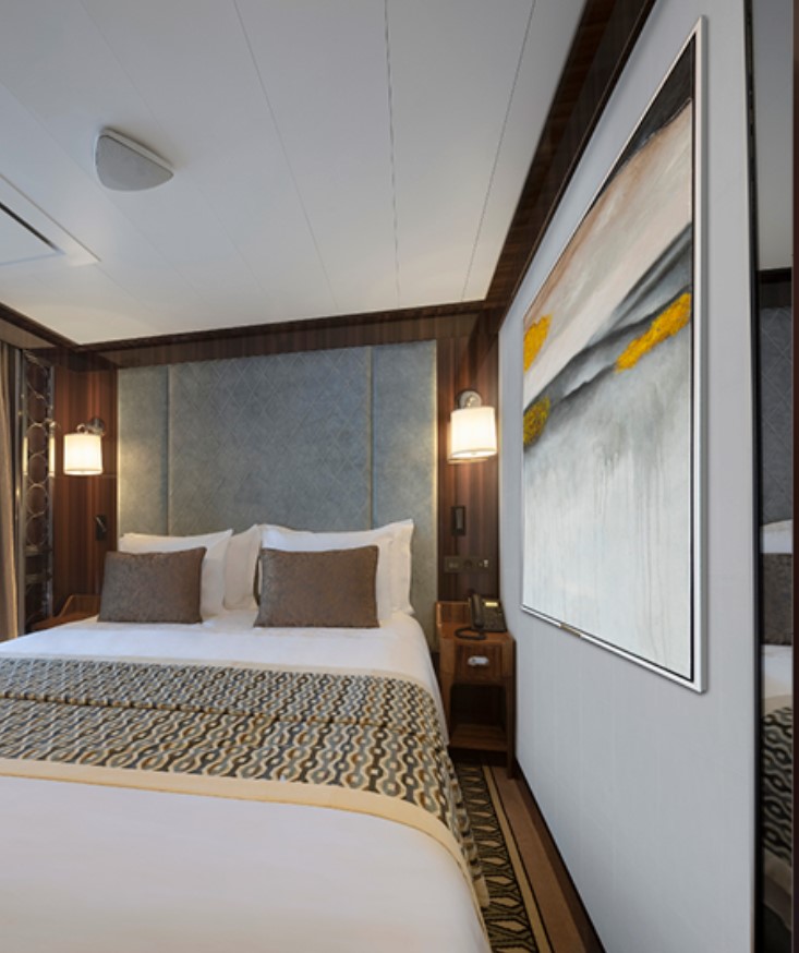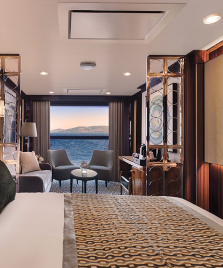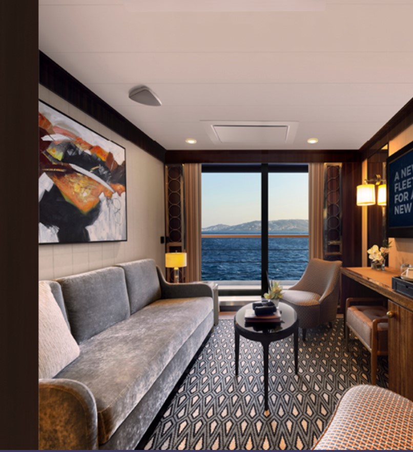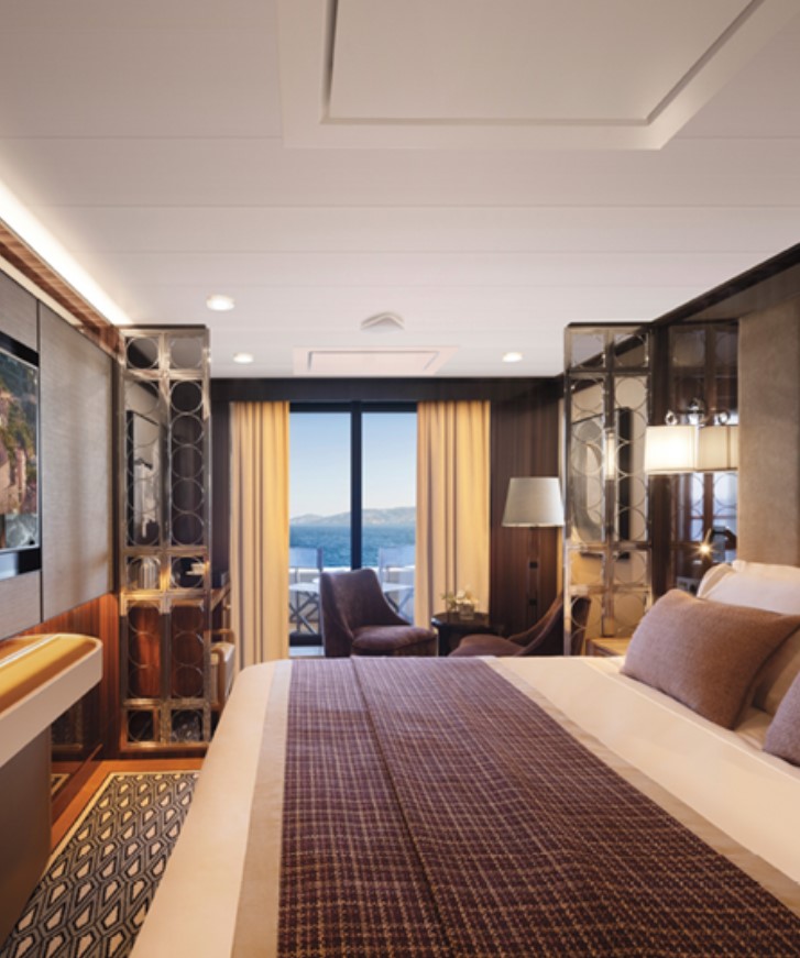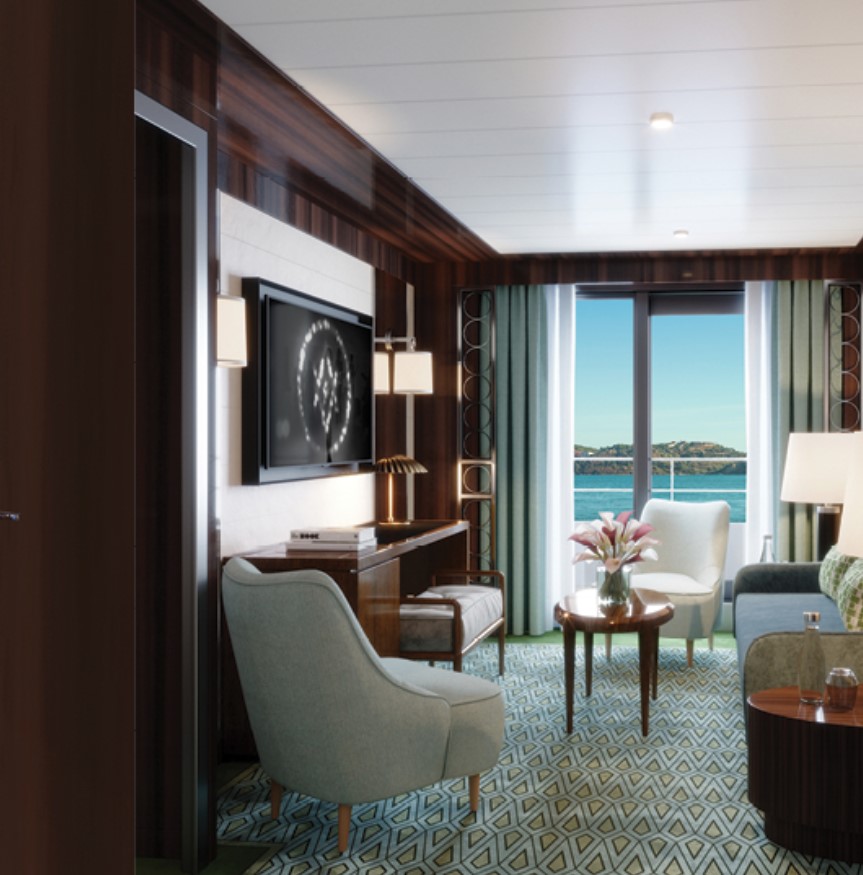 Horizon Stateroom (A1/A2) – Located on Deck 5 and 6 accommodates up to 2 guests, 270 sq. ft. including Juliette Balcony with top-drop electric window and a sitting area with sofa and TV.