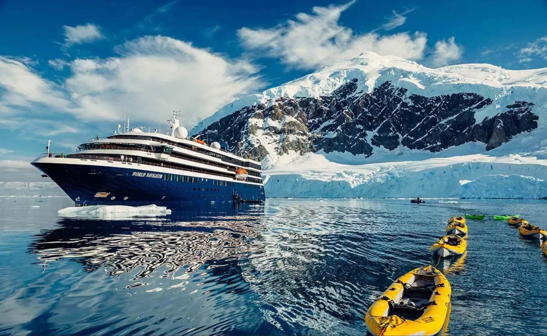 Set sail on a voyage of discovery with the World Navigator (Sister ship to Atlas' World Traveller and World Voyager). Experience the classic charm of 1940s aesthetics blended with modern style. Enjoy top-notch accommodations, delicious gourmet cuisine, and unlimited premium cocktails aboard World Navigator. Take in the sites and wildlife on your polar adventure while enjoying relaxed luxury.
