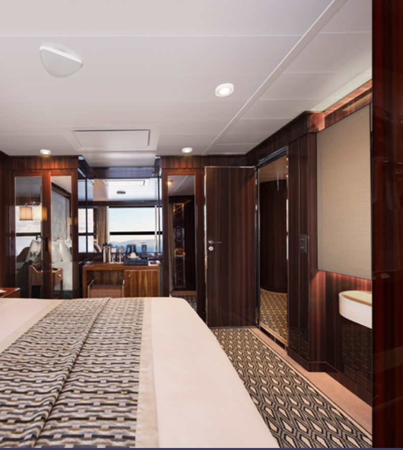 Discovery Suite – Spacious 1-bedroom with a private balcony. This suite includes Butler Service and Expanded Room Service, located on Deck 5 and accommodates 2 guests. 445 sq. ft. of luxurious living space, walk-in closet and wardrobe. Featuring a comfortable living room with a sofa and an elegant vanity and two wall-mounted TVs.