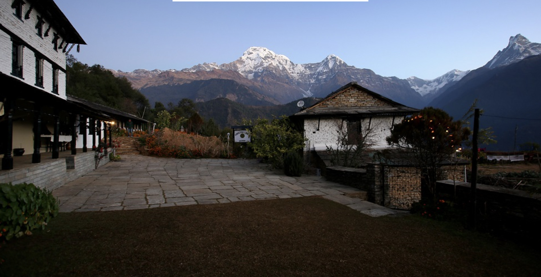 Surrounded by panoramic mountain views, and comprising of a restaurant, bar, and a beautifully landscaped garden terrace, Dhampus Lodge feels like a mountainside secret. There’s a real retreat ambiance here. Guests gather on the grassy terrace for drinks and massages as the sun sets over the mountains, then head into the cozy dining room for a fire, the fully stocked bar, and for dinner. Bright rooms set in a row face the fantastic panoramic views of the Annapurna Range. You’ll find floors adorned with Nepalese carpets, blankets and artwork. There’s hot running water in the well-designed en suite bathrooms, as well as cozy slippers and jackets for the cooler hours.