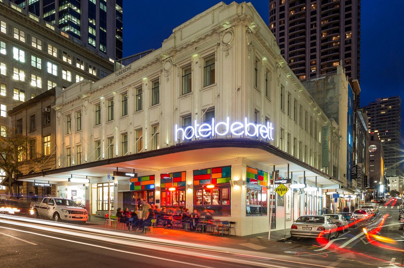 Hotel DeBrett is a character-rich boutique hotel located in the heart of Auckland’s city center, nestled between High Street’s shopping and the Britomart precinct. Set in a restored 1920s building, the hotel features individually designed rooms with bold color palettes, custom New Zealand-made furnishings, and signature striped carpets. Guests can enjoy dining in the glass-roofed atrium of DeBretts Kitchen, relax in the retro-inspired drawing room, or explore nearby galleries, bars, and boutiques.