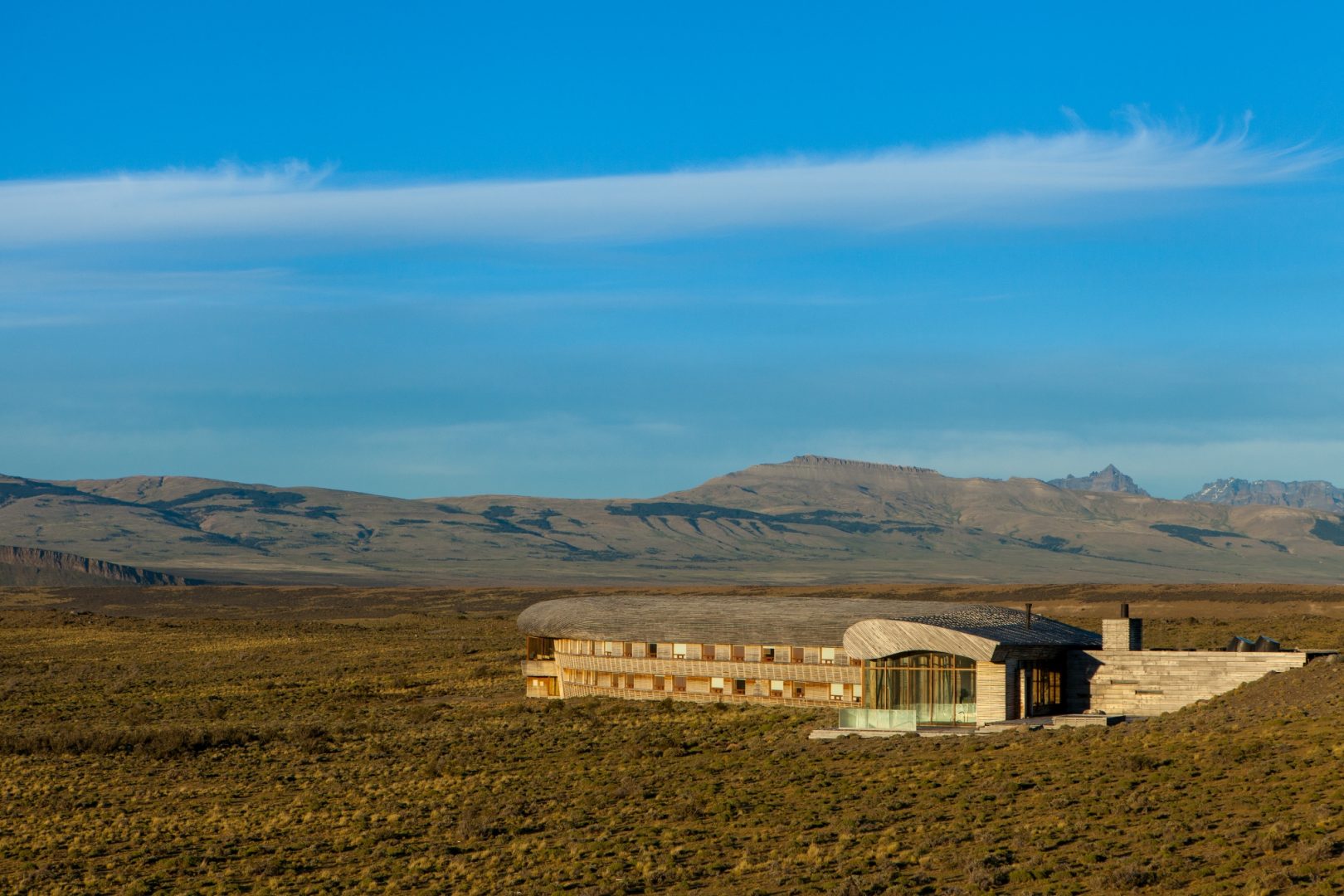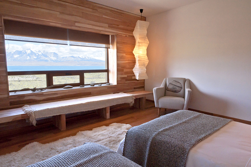 An exceptional option in the area of Torres del Paine National Park, Tierra Patagonia Hotel sits on a bluff where the pampa meets Lake Sarmiento, with views across the lake to the peaks of the Paine Massif from all rooms. The beautifully well-designed building seems to emerge from the hillside and blends harmoniously with the landscape. Patagonian details decorate its three suites, 34 superior rooms and three standard rooms. The hotel has a restaurant and bar, library lounge, spa with heated pool and hot tub, and one of the loveliest views in Torres del Paine.