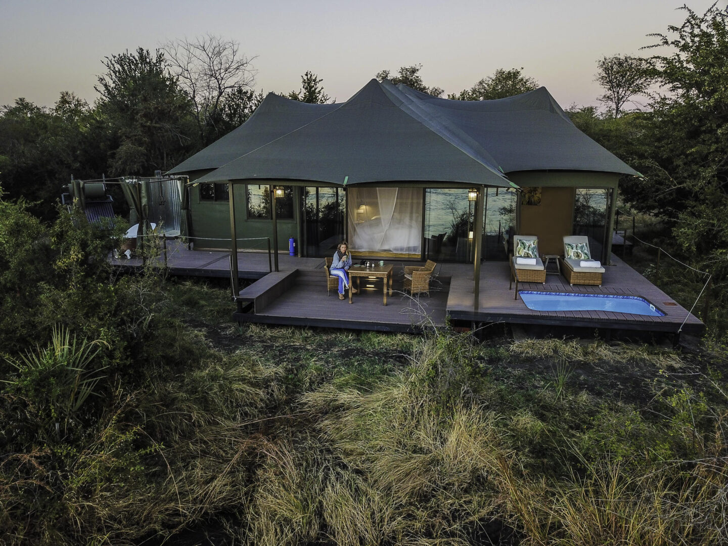 In the afternoon, relax at your lodge or lounge in the pool with a drink in hand as you gaze out across the river and spot animals as they go about their day.